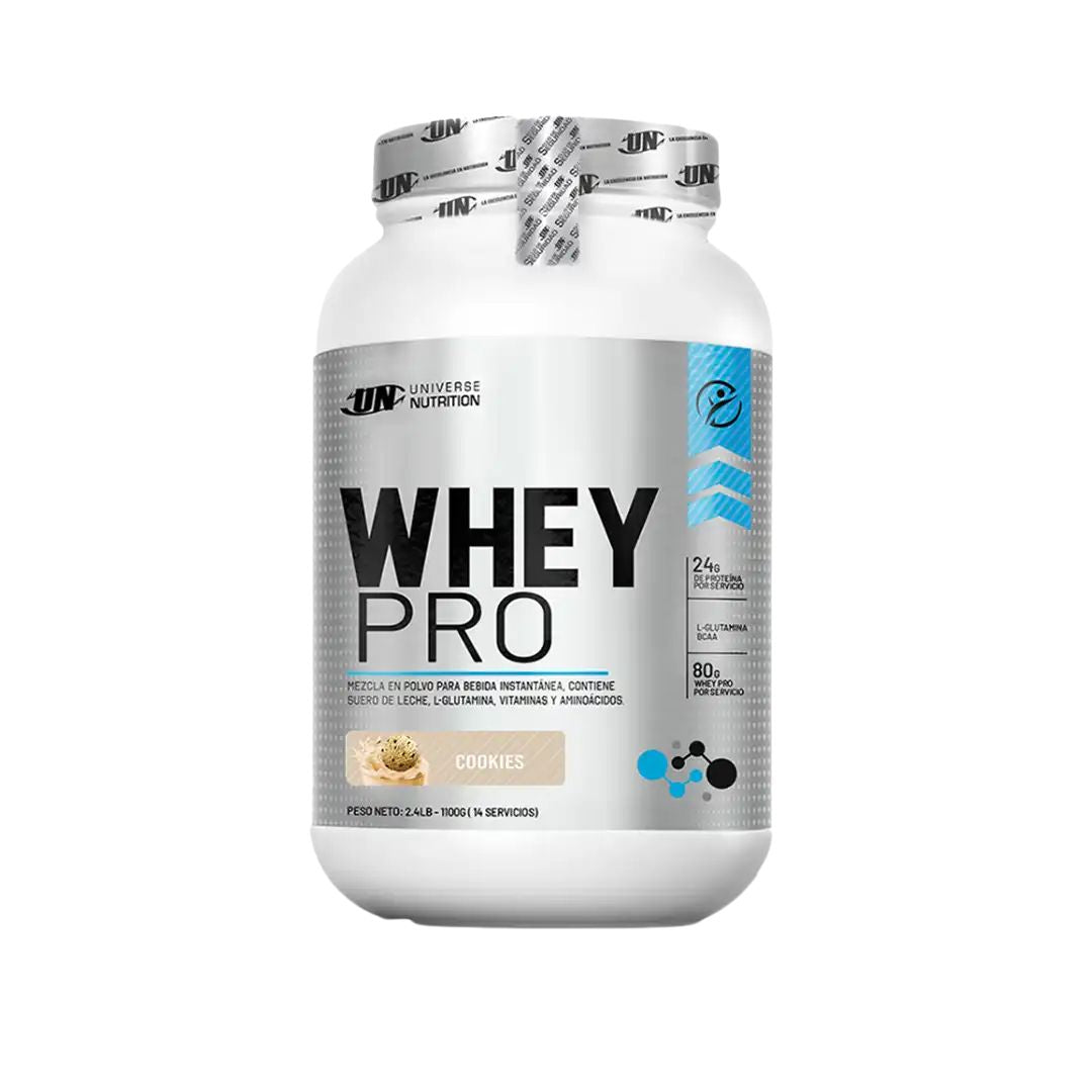 Whey Pro de Universe Nutrition es una proteína de suero de alta calidad que favorece el desarrollo muscular, la recuperación post-entrenamiento y el mantenimiento de masa magra. Ideal para deportistas y personas activas que buscan una nutrición efectiva y deliciosa. Disponible en presentación de 1.1 kg con aproximadamente 30 porciones, 3 kg con 82 porciones y 5 kg con 137 porciones